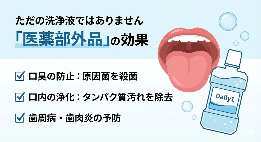 化粧品タイプのマウスウォッシュを爽快感はあるものの、有効成分が含まれていないことがあります。医薬部外品を選びましょう。
